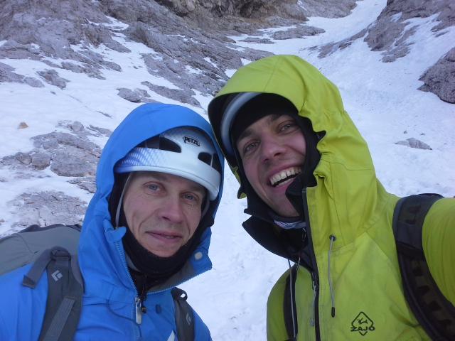 V steno sta se podala v torek in sprva plezala nenavezana, a sta se zaradi slabe kvalitete skale hitro navezala. Spodnji del stene je bil kopen, višje pa se je pokazal sneg in omogočil hitrejše napredovanje. Noč ju je ulovila malo pod izstopnimi kamini kjer sta se odločila za bivak.