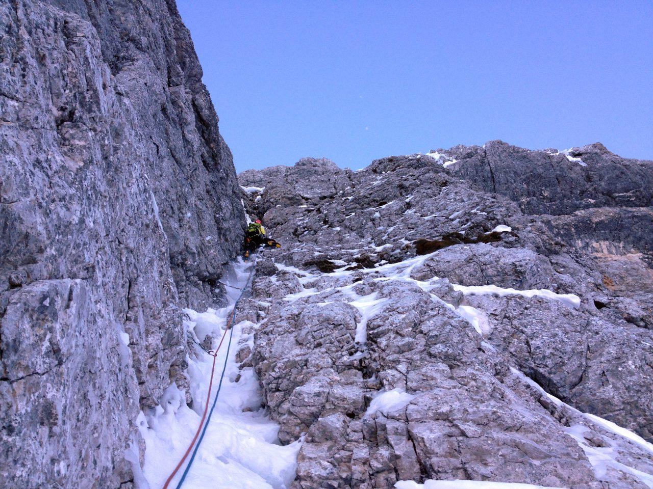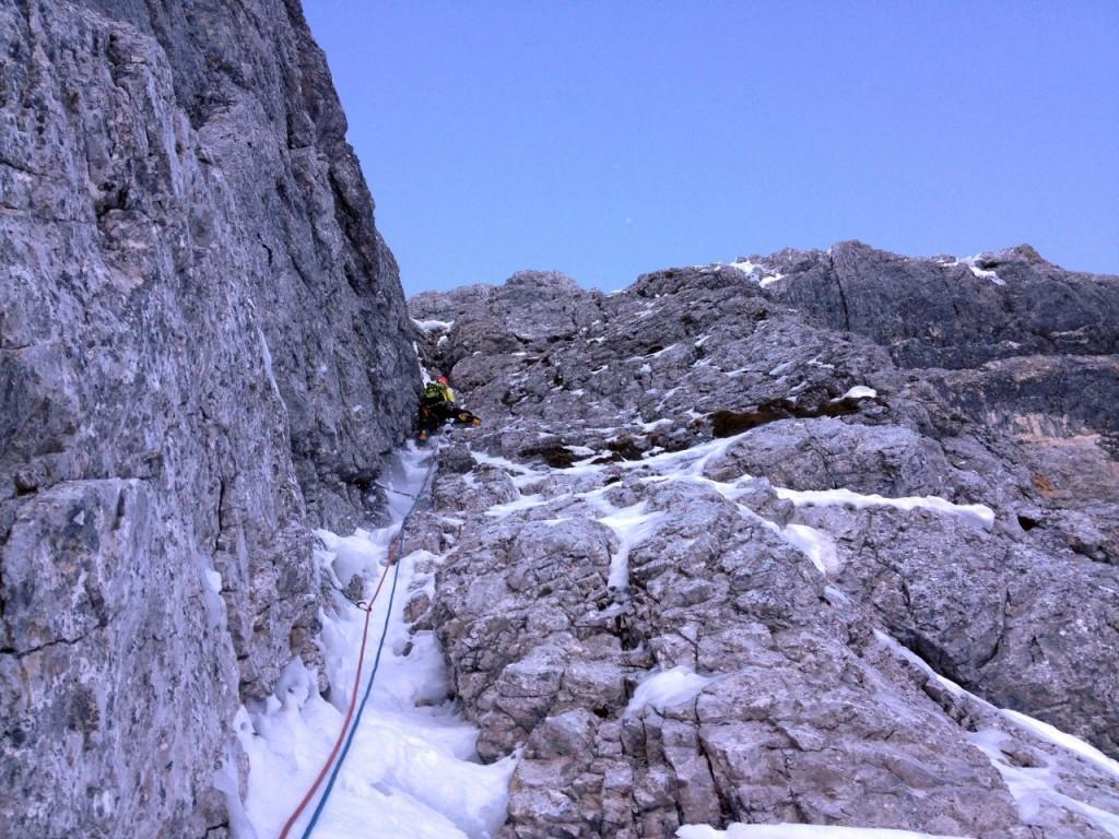 Smer je v sredinskem delu ponudila odlično plezanje v mešanem terenu. "Gužvanje" v ozkem kaminu so natrenirali že v spodnjem delu, tako da so bili v “pravem” kaminu že pravi mojstri. Vmes jim je smer zasolil tudi krušljiv previs, ki ga je po tekmovalnem študiju prvi zmogel mladi Miha. Razmere so bile še vedno super, le v vršnjem delu se je precej prediralo.