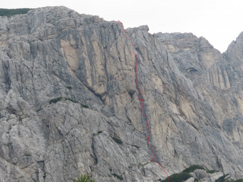 Vstopimo po poči čez plate, dosežemo manjšo polico, kjer zavijemo desno v plate in nato naravnost gor na varovališče.