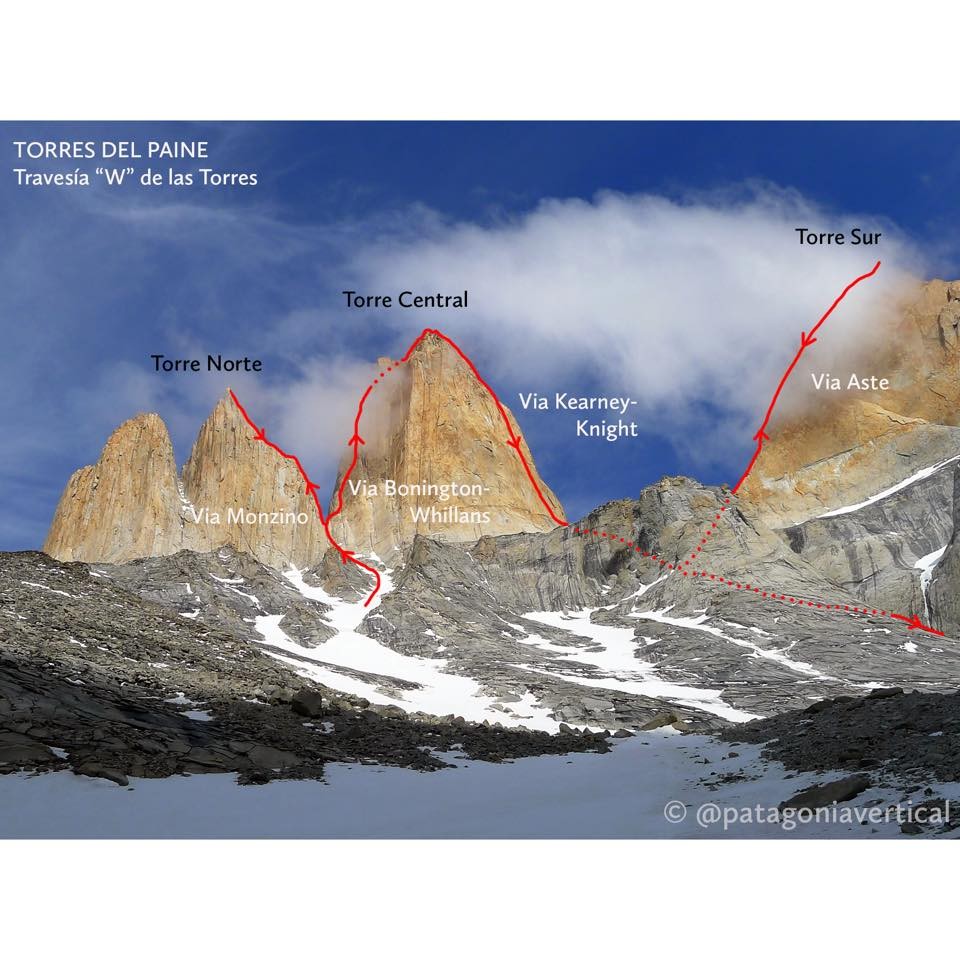 Začela sta na sedlu Bich od koder sta po smeri Monzino priplezala na Torre Norte, od tam po Bonington-Whillans na Torre Central, "abzajlala" sta po Kearney-Knight, in se nato spet po smeri The Aste povzpela na Torre Sur.
