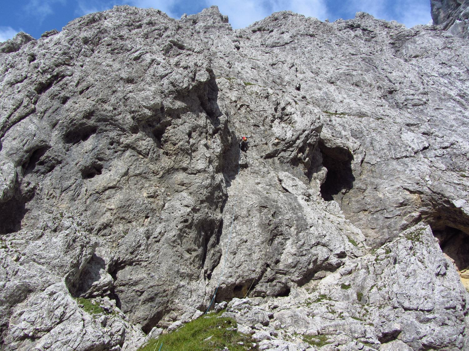 7R: po grebenčku do stene, nato desno dokler se ti v levo ne odpre prehod v steno. Navzgor in proti levi čez ploščo in pod nekakšen previs. Čezenj in navzgor v žleb do stojišča.