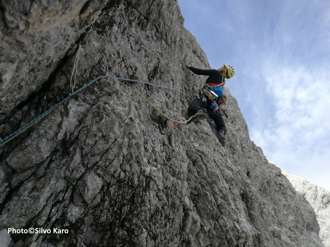 Jegličeva, trenutno verjetno naša najboljša alpinistka z izredno motivacijo in predanostjo plezanju ter Karo, legenda slovenskega alpinizma, sta včeraj združila moči in preplezala prvenstveno smer Obraz Ponce (VII+/V, 420m).