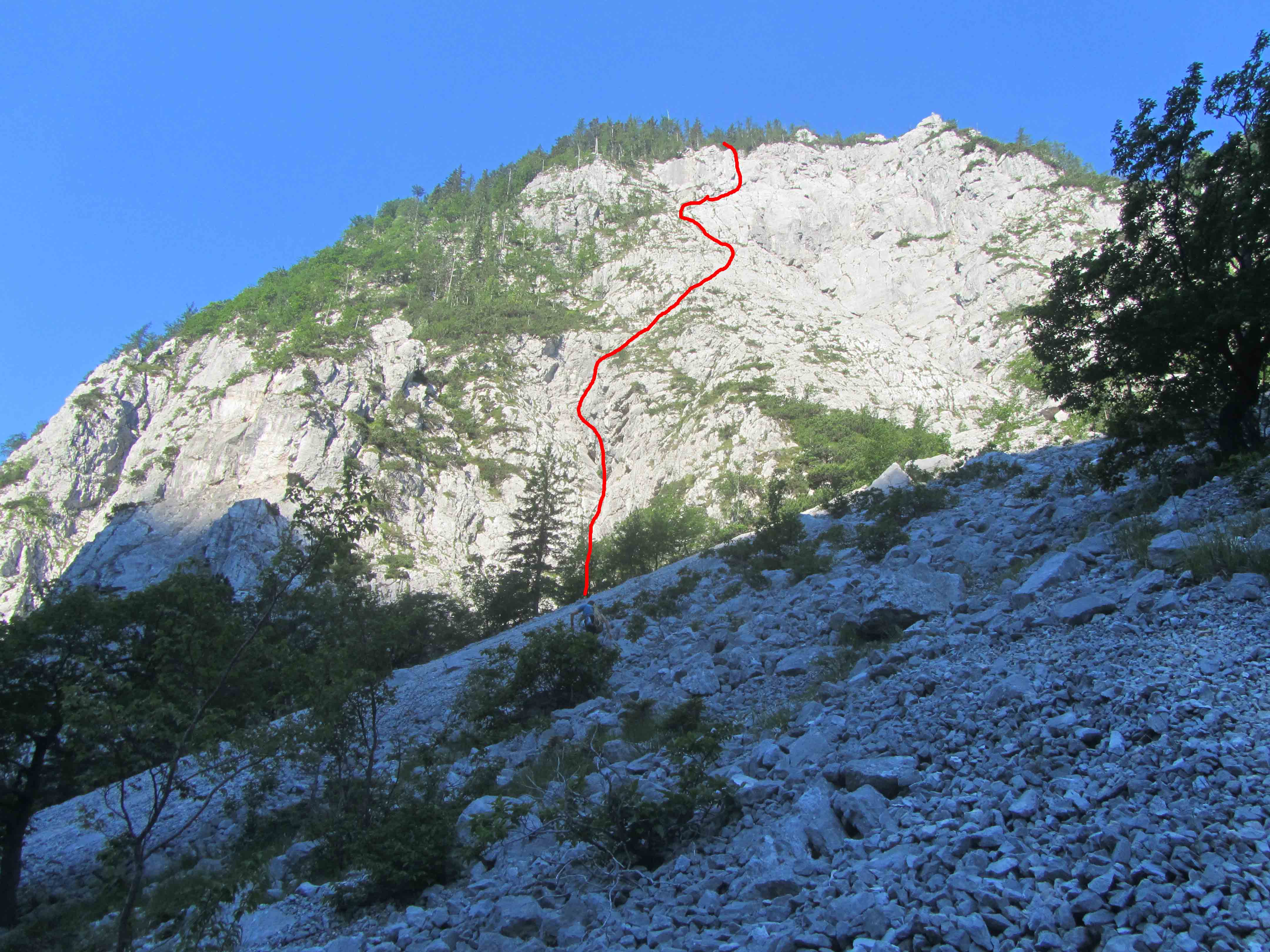 Nevarnost padajočega kamenja v priljubljeni smeri v vzhodnem ostenju Begunjščice.