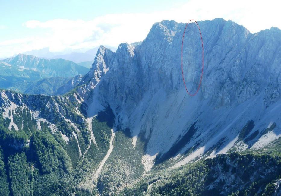 Podor je viden v osrednjem delu stene, prav tako pa je opaziti razpoke na robu stene oziroma nestabilnost vršnega grebena.