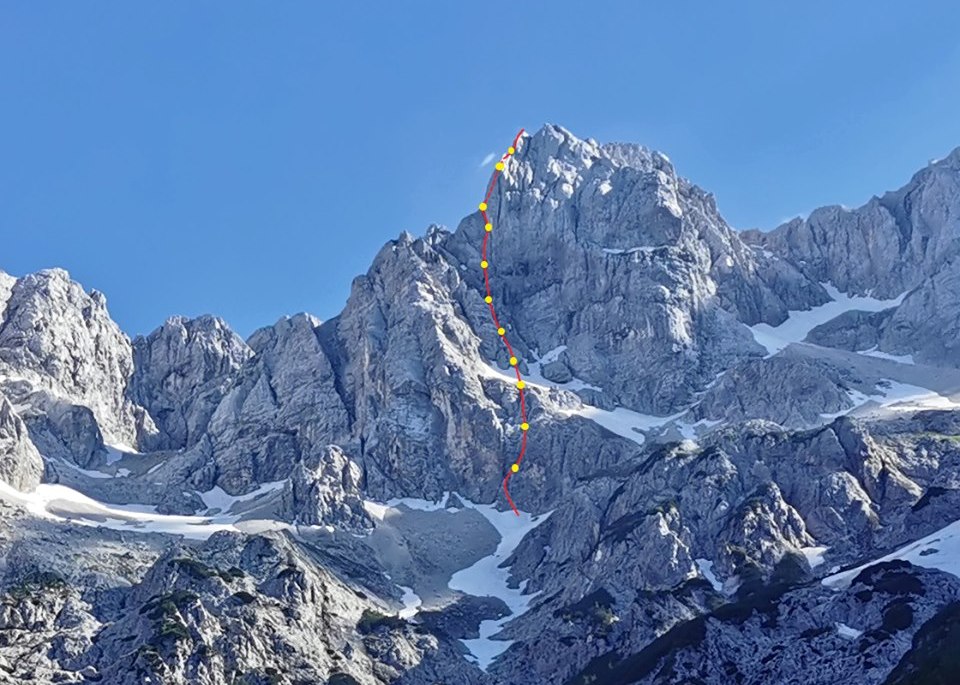 Ocena: V+, 600m (1R, V, 60m; 2R, IV+, 60m; 3R, III, 60m; 4R, melišče; 5R, II-III, 60m; 6R, III, 60m, 7R, II-III, 60m; 8R, V-, 60m, 9R, V-, 60m; 10R, V+, 55m; 11R, IV+, 40m in 12R, V+, 60m)