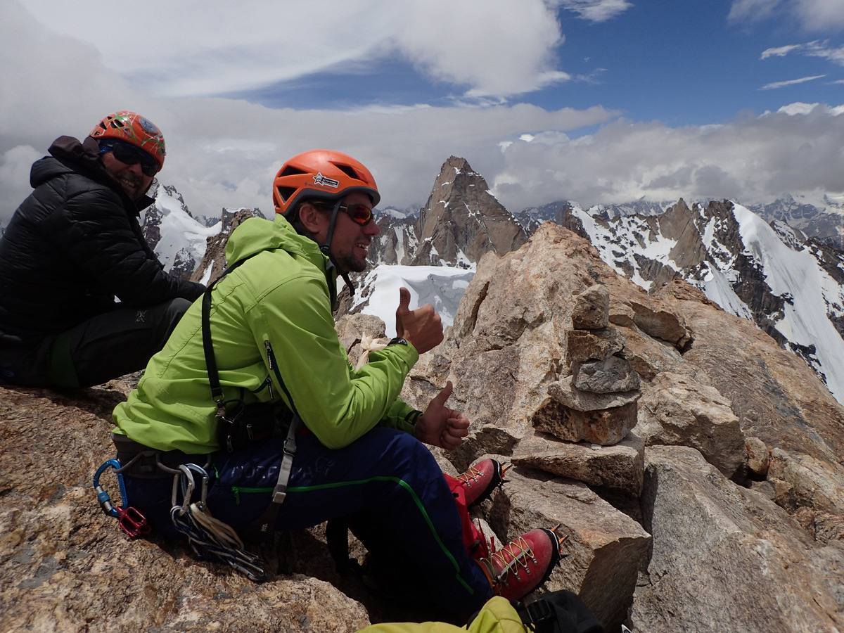 Napade me vročina (povišana telesna temperatura), Tomaž in Matjaž pa ne popuščata in odneseta vsak svoj nahrbtnik, poln opreme, (nista bila lahka) na zgornji plato ledenika Rangtik in tam odložita opremo. Sestop v dolino nam res dodobra napolni baterije, in ko grizemo v breg nazaj proti baznemu taboru, slutimo, da smo zdaj tisti pravi. Matic in Tomaž se sicer ubadava z običajnimi težavami starostnikov (bolečine v križu, pogosto uriniranje itd.), Matjaž pa kar poka od energije. Ko ga zavohajo jaki, ki so med našo odsotnostjo naselili bazni tabor, jo brž ucvrejo nazaj v dolino. Deževen dan nas malo ohladi, naslednji pa je brez dežja in odpravimo se proti Chakdor Ri (6193 m, aka H8). Noč na ledeniku pod steno je udobna, poslušamo glasbo, jutranje meglice pa soncu preprečujejo, da bi nas ogrelo. Žreb je določil vrstni red vodenja naveze. Bili smo pogumni in imeli srečo (tudi pri žrebu). Plezanje začnemo po snežni rampi, ki se s strani izteče v jugovzhodni raz gore, tam, kjer sva poskusila že lani z Nastjo. Po 100 metrih se preobujemo v plezalke in pod previs pospravimo čevlje, dereze in cepine. Prvi dan plezanje ni težko, težki so le naši nahrbtniki. Popoldan je v znamenju izdelave izravnave za udobno bivakiranje, poskusa rehidracije naših teles in filozofiranja. Na višini približno 5850 m si uredimo bivak. Naslednji dan čakamo, da sonce ogreje skalo in nas. Danes smo opremo skrbno izbrali; 24 metuljev, set zatičev, 10 klinov, 5 litrov pijače, vsak svojo puhovko, teniske, čelke, v žepe zatlačimo nekaj energetskih ploščič, navežemo se na dvojno vrv, vzamemo še nekaj kompletov in zank ter začnemo plezati. Matjaž dobro vleče raztežaje. Plezanje je resno, a prijetno. Prehode iščemo na desni (gor gledano) strani raza. Brez obotavljanja zmerno napredujemo. V glavnem se držimo poči, včasih pa potegnemo tudi čez plošče, kjer je treba malo več zbranosti, saj je tam varovanje slabše. Okoli petih popoldan smo na vrhu. Opravili smo prvi pristop na Chakdor Ri (6193 m, aka H8). Ko smo zadovoljni (in zaskrbljeni obenem) gledali okoli sebe, nismo bili prepričani, ali stojimo na najvišji točki gore, saj je vršni greben precej horizontalen, ozek, a ne težak. Ker nas je zajelo poslabšanje vremena z močno statično elektriko in sneženjem, se nismo ukvarjali s tem, kateri skalni blok v vršnem grebenu je morda 5 m višji od našega stojišča, v skalni mostiček smo privezali rdečo molilno zastavico, ki nam jo je v ta namen dal Lobsang, ter vso energijo usmerili v sestop. Veter je bil vse močnejši, sneženje pa vse gostejše. Spuste po vrvi smo urejali na (gor gledano) levi strani raza in do večera dosegli bivak, kjer nas je čakal šotorček, elektrika je pa tudi popustila, ko smo izgubljali višino. Ali je res? Naslednje jutro smo v oblačnem vremenu in rahlih padavinah nadaljevali s spusti po vrvi do vznožja stene. Na zgornjem platoju ledenika Rangtik smo si na ramena naložili še nekaj opreme in sestopili vse do baznega tabora. Treba je bilo le še izbrati ime smeri. Predlogi, kot so Šarlatans from Balkan ali pa Rolling stones spoznajo moje starše ali Only Lovers Left Alive so povsem nekorektni in neprimerni, zato se odločimo za Treasure of Zanskar. Višina smeri 750 m, splošna ocena ED+, v skali od III do VII- (po UIAA težavnostni lestvici), sneg in led do 55 stopinj naklonine. Plezali smo od 31. 7. 2017 do 2. 8. 2017 (vrh 1. 8. 2017). Vzpon je bil seveda opravljen v alpskem slogu. Matjaž in Matic sva celotno smer preplezala prosto (na pogled oz. flash), Tomaž pa na dveh mestih A0. Varovanje smo v glavnem urejali z zatiči in metulji, na vzponu pa smo zabili tudi 5 klinov, ki jih nismo izbili. Spuste smo v glavnem urejali na skalnih rogljih, nekaj pa jih je tudi na klinih, metuljih in zatičih. Sledilo je nekaj dni počitka v baznem taboru.