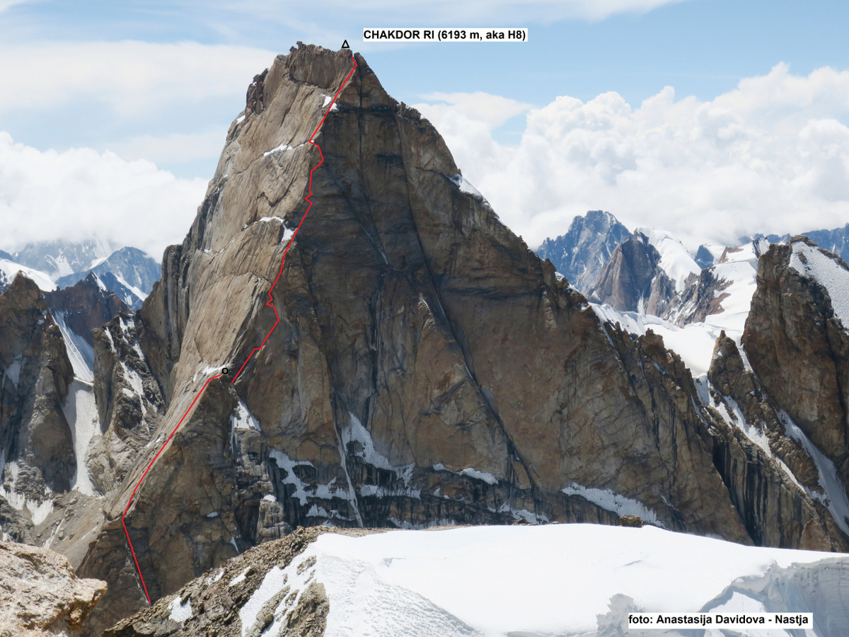 Vris smeri Treasure of Zanskar v jugovzhodni steni Chakdor Ri (6193 m). Pogled z zahodnega vrha Remalaye (6266 m). (foto Anastasija Davidova - Nastja)