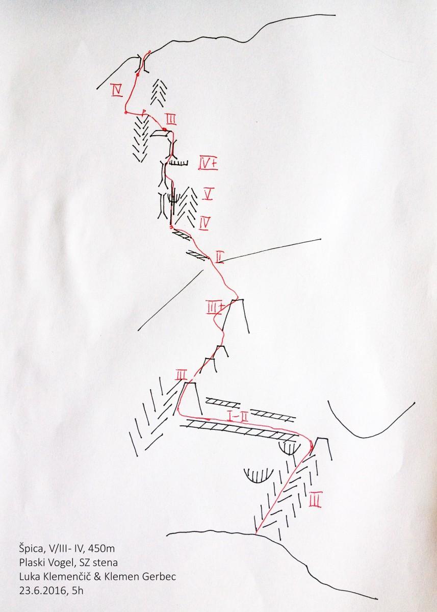 Ostenje severozahodne stene Plaskega Vogla, kjer sta Gerbec in Klemenič preplezala prvenstveno smer, se tako sedaj ponaša z novo linijo - Špica, V/III-IV, 450m, 5h.