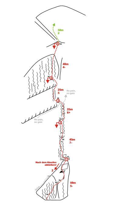 Skandal je 170 metrov dolga in 7- težka smer, katero sta Avstrijca delno opremila tudi s svedri. Prav slednji so razlog za ime, kot je Stefan povedal za Friko.si: "Smer je morda malo kontroverzna, ker sva za napredovanje uporabila tudi svedre in naredila še dodatno "stezo" za spust čez steno (pri tem pa nisva posegla v druge smeri v tej steni razen najine No pain no gain). To je tudi razlog za ime. Toda, v mojih očeh bi bil škandal tudi, ne preplezati tako lepe linije..."