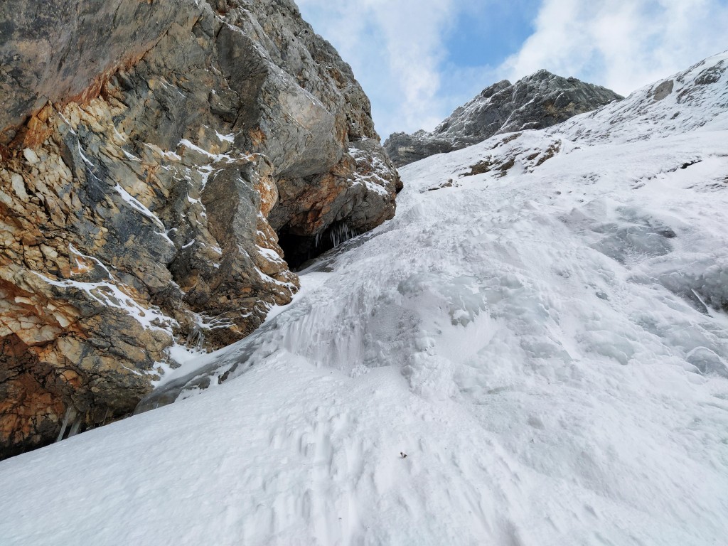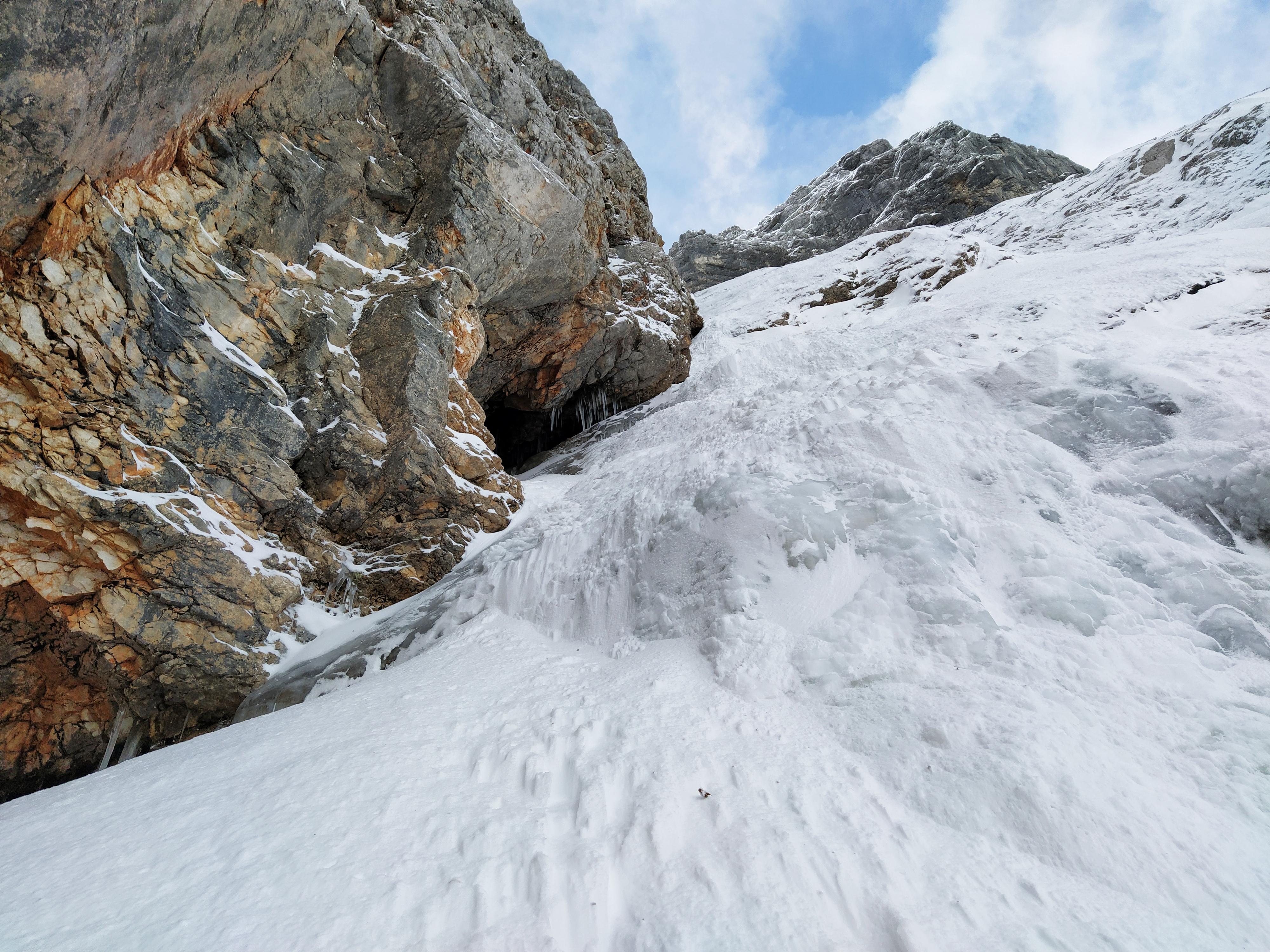 Rašičani so pred dnevi v večjem številu plezali znano ledno-snežno linijo, veliko zimsko klasiko, Teranovo smer (III/3, M, 350 m) v Dolgem hrbtu. Smer je v stmejših delih dobro zalita z ledom in predelanim snegom, ponekod v položnejših delih pa snegše ni predelan.