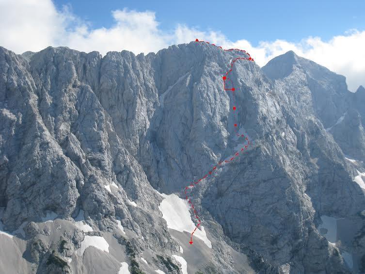 Opis: Iz vrha Dolgega hrbta sledimo markirani poti v smeri proti Mlinarskemu sedlu. Po kakih 15 min na desni opazimo dva možica. Desno za rob pa se odpre velika gruščnata polica. 5m za robom opazimo rdečo piko. Ko najdemo prvo jim sledimo, sprva prečno po grušču nato pa v hoji in lažjem poplezavanju (do II.) se spustimo cca. 150 višinskih metrov, ko pridemo do prvega urejenega sidrišča. Prvi spust lahko v plezavanju do III. izpustimo. Vendar je izpostavljeno.