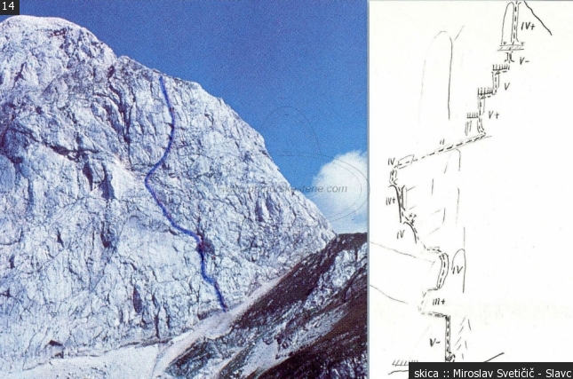 Smer je prvi preplezal Slavc Svetičič septembra 1987, ko je delal kot oskrbnik koče na Mangartu. Takrat si je zabeležil, da je zelo markantna smer.