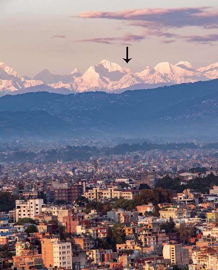 Panoramski pogled na Katmandu, kot ga je videl Chobar 10. maja. Od leve proti desni: Gang Chhenpo, Urkinmang, Kangshrum, Gurkapo Ri, Dorje Lakpa, Lonpo Gang, Gyalzen Peak, Phurbi Ghyachu, Choba Bhamare, Gauri Shankar, Kang Nachugo, Mt Everest, Chobutse in Trakar Go.