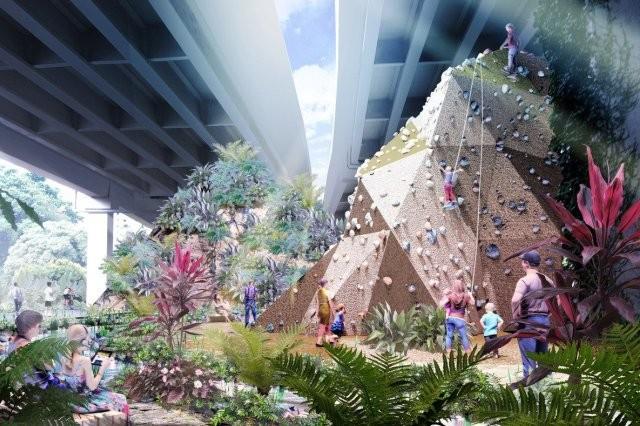 Večina železniške proge teče po tleh, a na dvignjenem delu se bo našlo nekaj zanimivega tudi za plezalce - pod mostom bodo postavili plezalno steno, ki bo na voljo vsem prebivalcem in obiskovalcem mesta, predvsem pa naj bi bila namenjena otrokom.