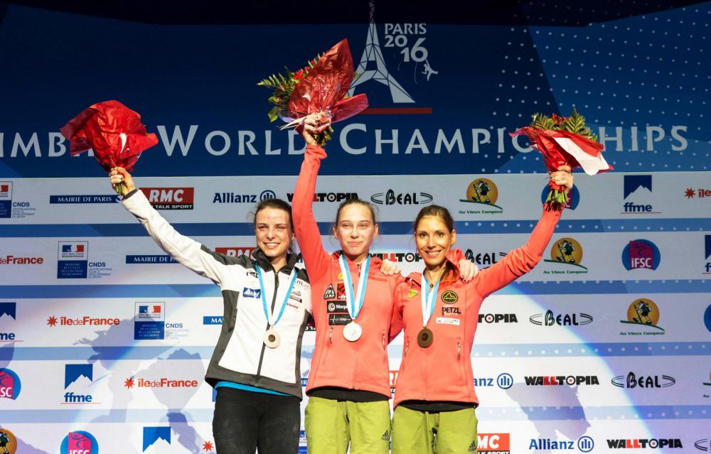 Janja Garnbret je na svetovnem prvenstvu v Parizu s sedemnajstimi leti z vrhom v finalni smeri stopila na vrh svetovnega plezanja. Druga je bila Anak Verhoeven, ki je v finalu enako kot naša tekmovalka dosegla vrh smeri, vendar se je Garnbretovi obrestovalo boljše plezanje v polfinalu. S tretjim mestom je za popoln slovenski večer poskrbela Mina Markovič. Naša reprezentanca je imela prvič v zgodovini svetovnih prvenstev dve tekmovalki na zmagovalnem odru.