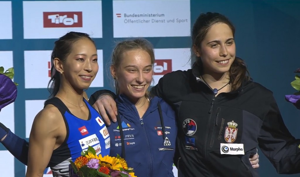 Janja Garnbret (Šaleški AO), ki se ji je 8. septembra naslov svetovne prvakinje v težavnostnem plezanju izmuznil za osem sekund, si je le slab teden pozneje priplezala svetovno lovoriko v balvanih. Dominantna že v kvalifikacijah in polfinalu je 19-letna Korošica na svojem prvem svetovnem prvenstvu v balvanskem plezanju tudi v finalu pokazala, da je razred zase in si tako že pred zadnjim balvanskim problemom priplezala zmago. "Finale je bil super težak, a bilo je čudovito. Izjemno vesela sem zlate kolajne, to, o čemer sem že dolgo sanjala, se mi je končno uresničilo," je sijala nova svetovna prvakinja v balvanih, ki je zaradi mature okrnjen balvanski svetovni pokal letos z dvema zmagama in enim drugim mestom (od sedmih tekem) končala na skupno četrtem mestu, lani pa bila druga. Srebra se je veselila Japonka Akiyo Noguchi, tretja na zadnjih dveh svetovnih prvenstvih, brona pa balvanska evropska prvakinja, Srbkinja Staša Gejo.