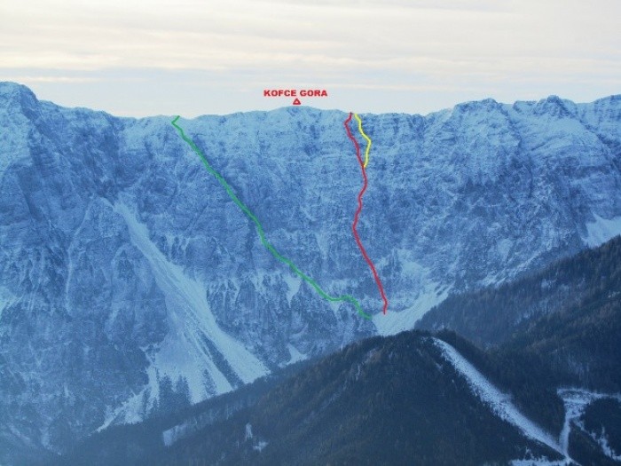 Naslovna fotografija: rdeča linija: Na svoji zemlji, rumena linija: Janezova izstopna varianta, zelena linija: sestop po "Z" grapi (ni zahodna, vendar je z grapa).