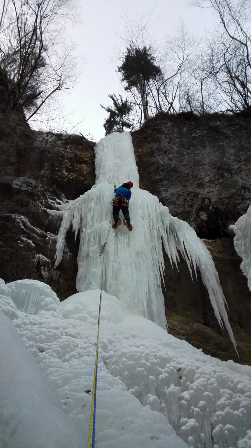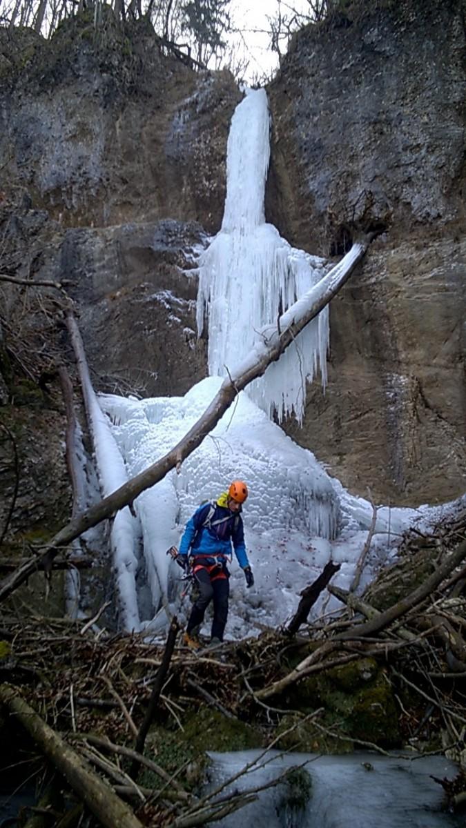 Slap, ki plezalca v kaskadah (ocena težavnosti do WI3) pripeljejo do glavnega dobitka - cca. 12 metrske sveče (ocena WI4) - sta plezala Nejc Štebe in Luka Kramarič (oba Freeapproved).