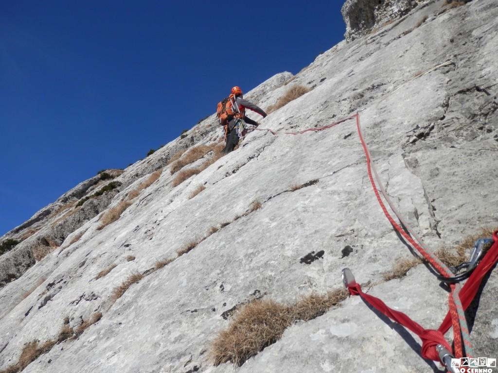 Opis: Smer vstopi na mestu, kjer Sebastijanova rampa zavije levo. Mi nadaljujemo naravnost do izrazitega odloma, ki z desne strani omejuje sklop plošč po katerih plezamo. Dalje nadaljujemo plesaje levo-desno in se držimo sredinske linije. Po dveh raztežajih zavijemo levo na raz, ki ga dvakrat prekinejo borovci in po njem na rob stene.