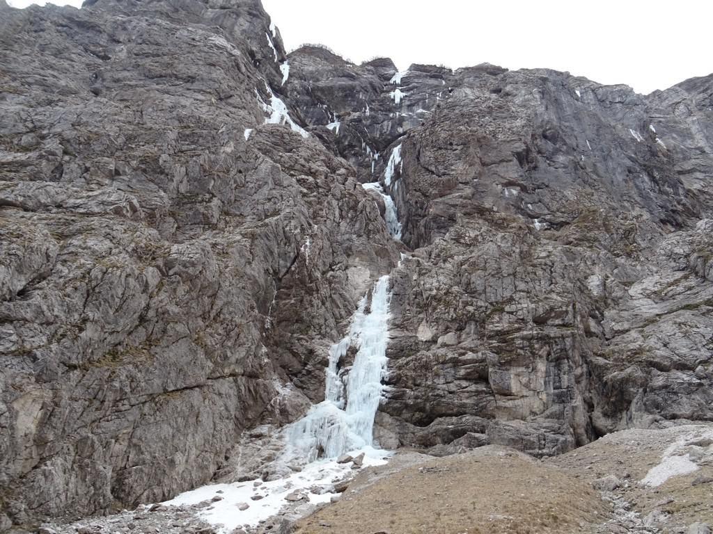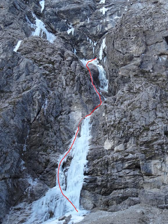 Po treh raztežajih v Demokleju sta zavila v ledni trak na levi in preplezala tri raztežaje nove variante, ki se na vrhu priključi originalu. Po podatkih, ki jih plezalca imata, ta varianta še ni bila splezana.