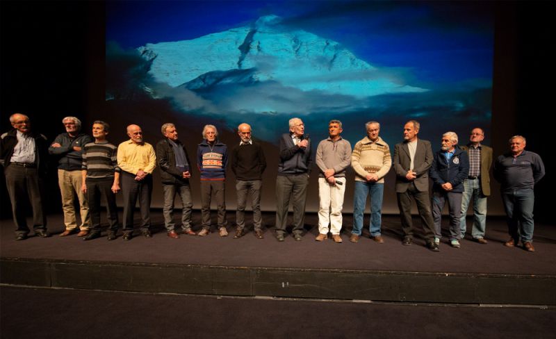 Štirinajst članov alpinistične odprave Everest 1979 na 13. Festivalu gorniškega filma: z leve Igor Tekavčič, Vanja Matijevec, Roman Robas, Marko Štremfelj, Ivč Kotnik, Stane Klemenc, Andrej Štremfelj, Tone Škarja, Stipe Božić, Bojan Pollak, Viki Grošelj, Vladimir Mesarić, Marjan Raztresen in Jože Zupan (foto Igor Kuster/FGF)