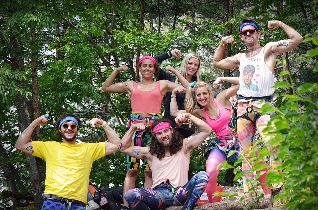 Prijateljsko druženje in plezanje v stilu osemdesetih v pajkicah in trakovi okoli glave.