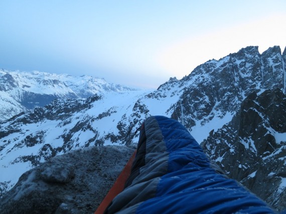 Močnik in Stanonik se dopoldne z gondolo odpeljeta na Plan de l'Aiguille ter dostopita pod Frendo spur in do večera izplezata iz skalnega dela smer na greben, kjer si uredita udoben bivak.