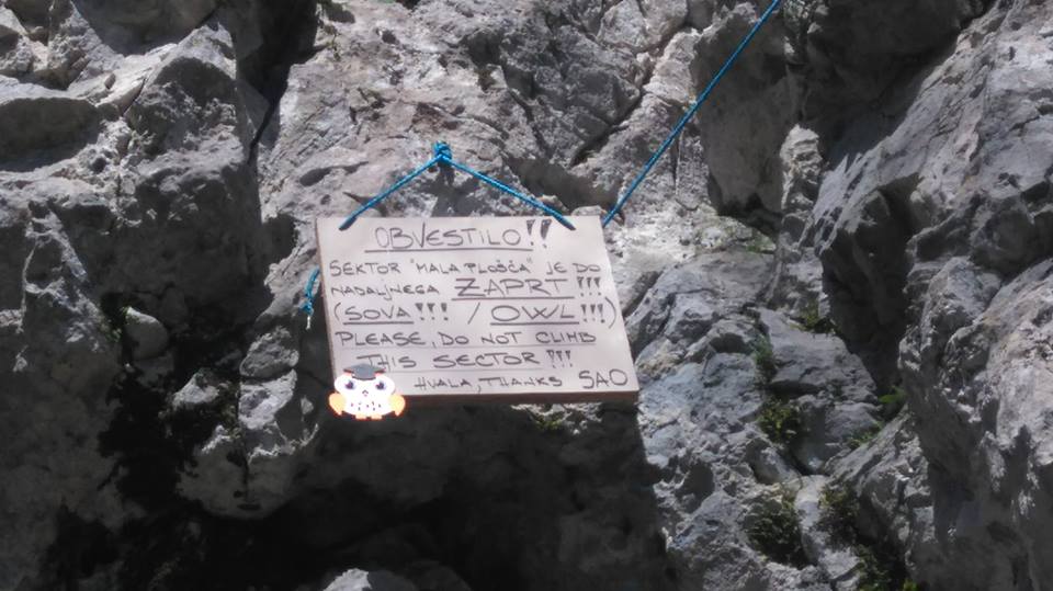 Do nas je prišlo opozorilo o gnezdenju sove v plezališču Senica. Tam je prepovedano plezanje v sektorju B - Mala plošča.