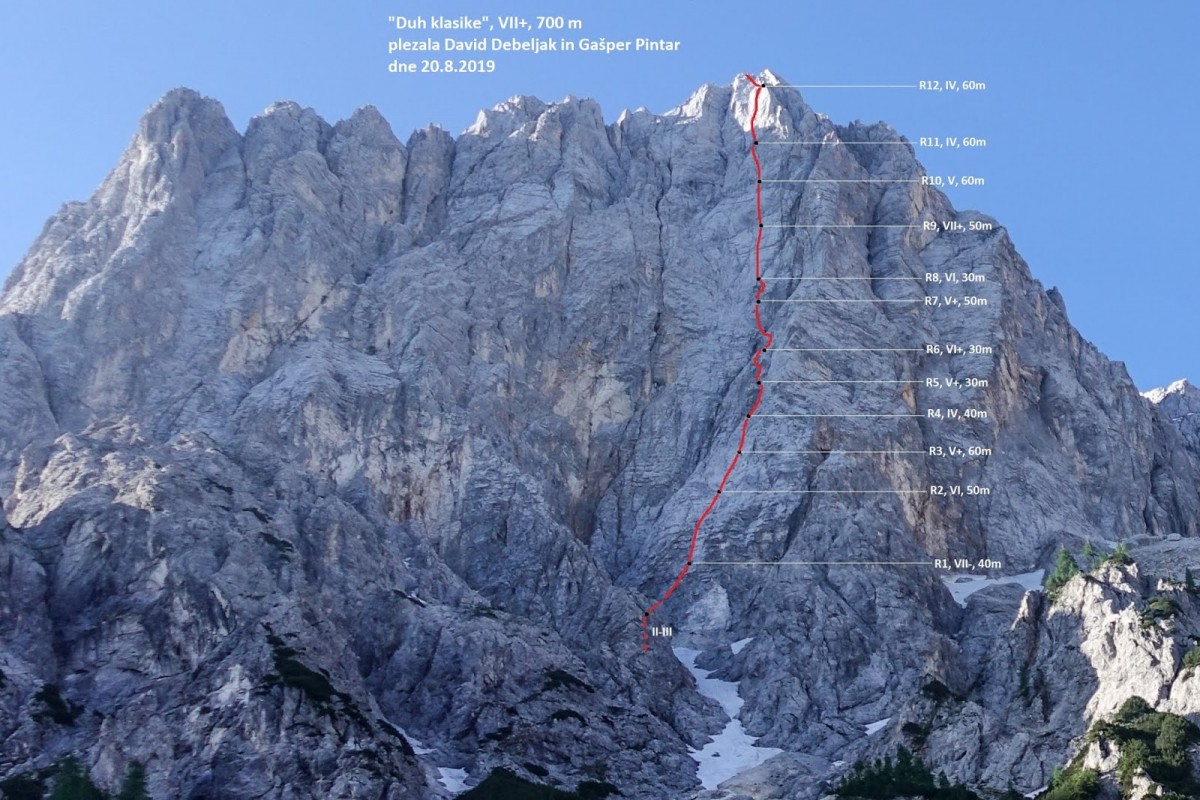20. avgusta sta kljub vsemu zagrizla in nastala je nova smer - Duh klasike (VII+, 700m). Smer načeloma poteka med Direktno smerjo in Večno potjo (avtorja Pavle Kozjek in Peter Podgornik), s tem da žal nisva mogla identificirati, koliko od lažjega sveta v spodnji polovici smeri je morda deljenega z Večno potjo. V sedmem raztežaju se križa z Direktno, potem pa zgornja polovica ponudi strmejšo skalo, odličen prehod pod strehico in dolg ključni raztežaj, ki predstavlja spodoben prostoplezalni izziv s sprotnim nameščanjem varovanja (v smeri sta pustila 2 klina, enega na štantu osmega raztežaja in enega pod krušljivo poko v sedmem raztežaju, ki sta jo sicer obšla po desni). Našla sta tudi sveder in dva klina v drugem raztežaju, za katere ne vesta, kam spadajo, možno da gre za kline Večne poti in morda naknadno dodan svedrovec? Varovanje v prvem raztežaju je rahlo delikatno, zato je Gašper v izogib divjim padcem ključno mesto preplezal z enim A0 gibom.