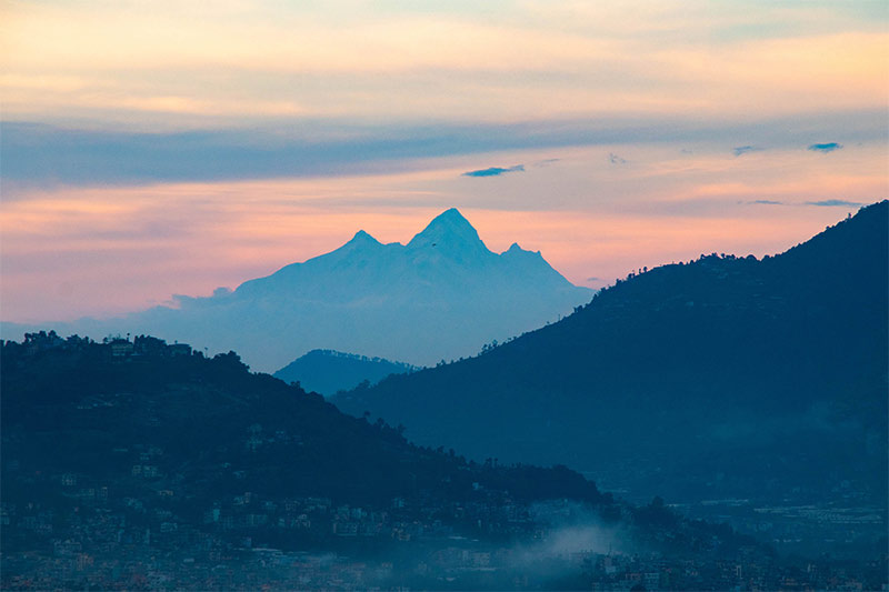 Trojica Baudhha Himal, Himalchuli in Manaslu ob sončnem zahodno od Katmanduja.