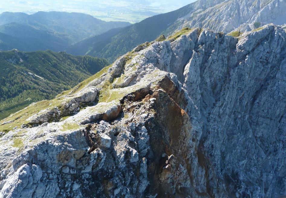 Podor je viden v osrednjem delu stene, prav tako pa je opaziti razpoke na robu stene oziroma nestabilnost vršnega grebena.