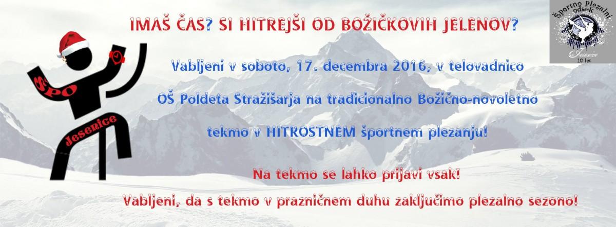Plezalna sezona je pri koncu, ŠPO Jesenice pa vas vabim, da jo skupaj z njimi zaključite v prazničnem duhu. ŠPO Jesenice namreč organizira tradicionalno Božično-novoletno tekmo v hitrostnem športnem plezanju.