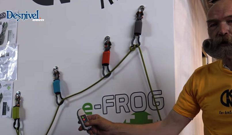 Zdaj pa zavoljo daljinsko upravljanih kompletov, ki so jih poimenovali e-Frog in jih predstavili na športnem sejmu v Friedrichshafnu, to ni več problem. Kompleti, ki se zapirajo na žabico, se lahko kadar koli odpnejo s pomočjo daljinskega upravljalnika. Tudi takrat, kadar obupate sredi stene in ste se prisiljeni spustiti nazaj na tla, jih lahko brez težav izpnete iz stene.