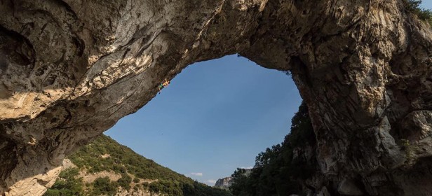 Američan je kot prvi opravil "deep water soloing" vzpon v več kot trideset metrov visokem oboku Pont d'Arc nad reko Ardeche v Franciji.